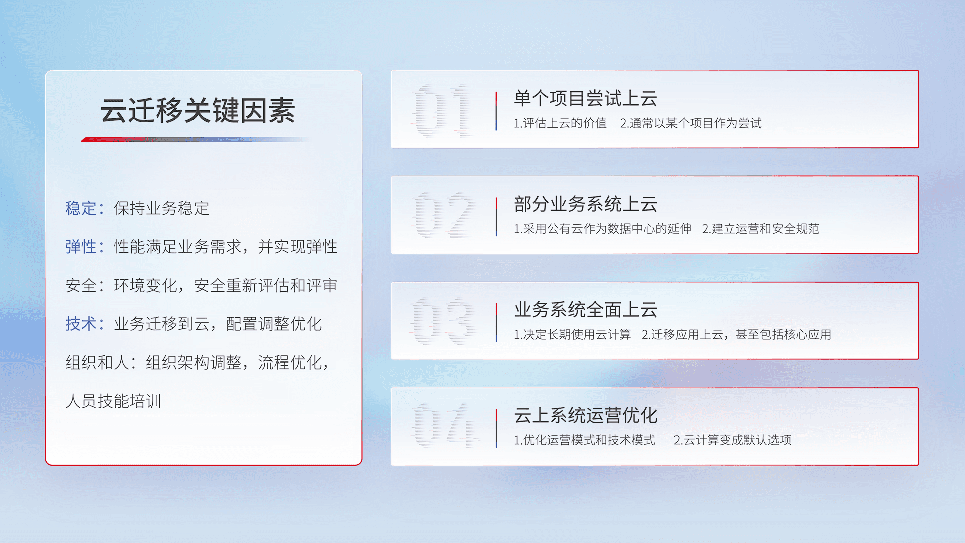 结合实际业务,,,从规划设计、、云平台选型、、、云原生改造、、、数据迁移、、、集成交付,,,,迁移全过程为客户识别最佳上云路径,,,做好风险识别管理,,,,设计网络架构、、身份权限、、、、安全审计合规、、、、操作审计、、日志审计、、、监控告警策略、、多站点容灾设计等,,,对云上基础设施进行整体规划,,提升IT治理水平,,,,以满足弹性、、高可用、、、高性能的需求。。。。