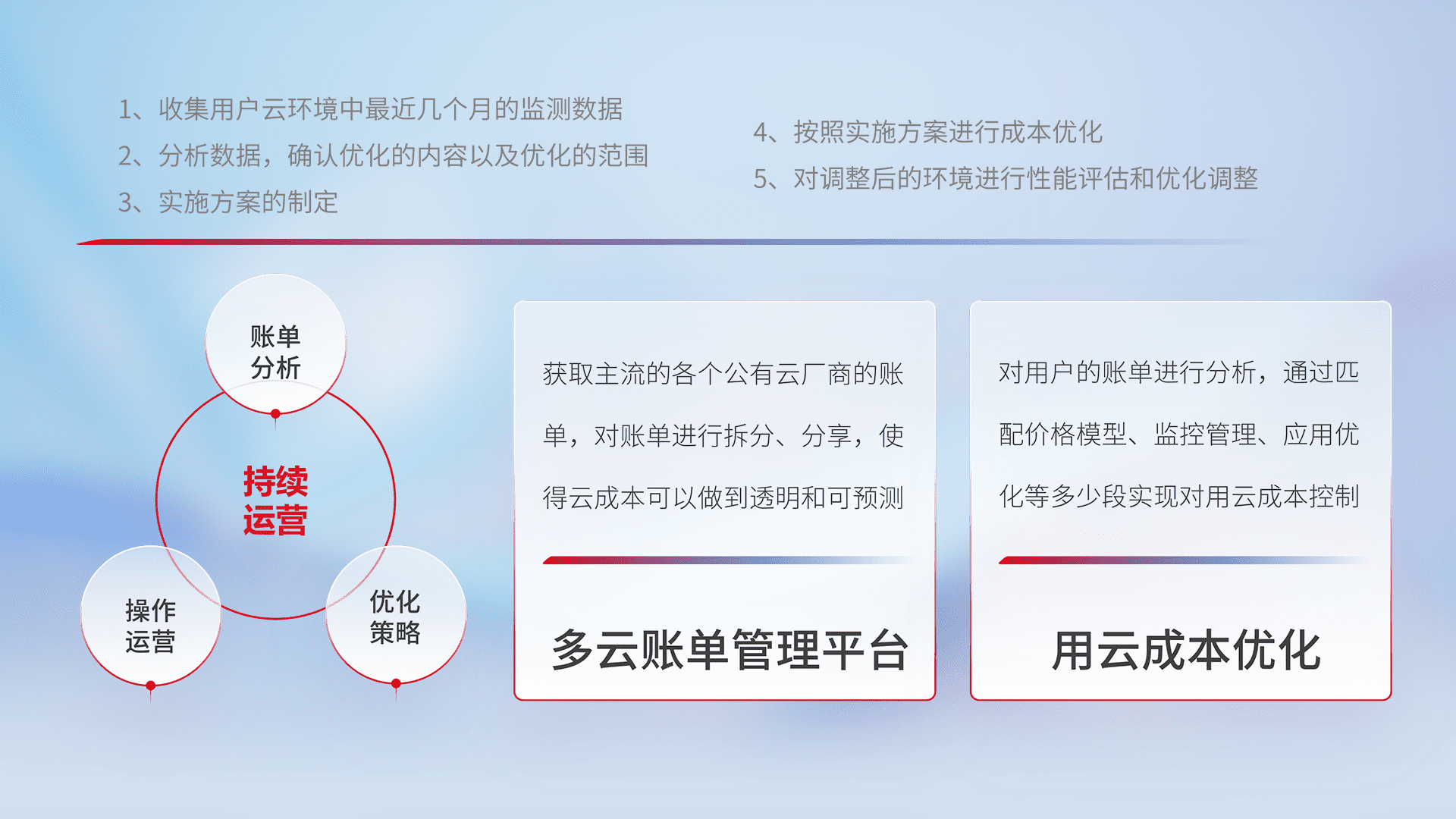 通过多云纳管,,,以统一的资源数据模型把客户的云资源进行抽象和封装,,进而实现对多云资源的统一操作,,,,保障云资源管理的可靠性、、稳定性与可用性。。量身定制化运维内容,,配置、、、开发运维、、、补丁管理、、、、备份、、监控、、、认证和访问管理、、、、审计和日常巡检等,,保障在用云过程中的可靠度,,稳定度以及高可用率。。。